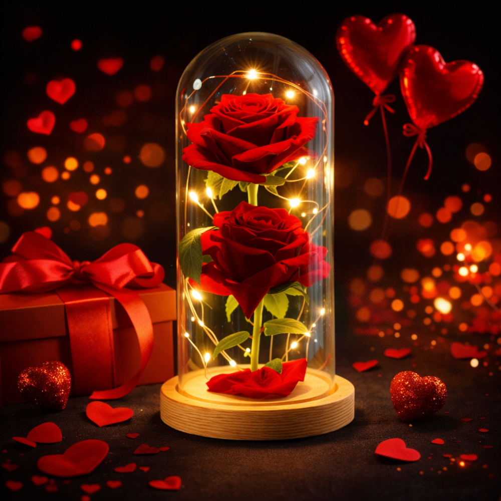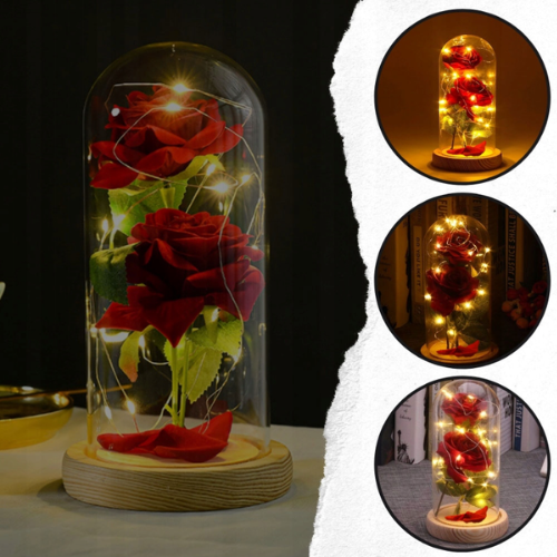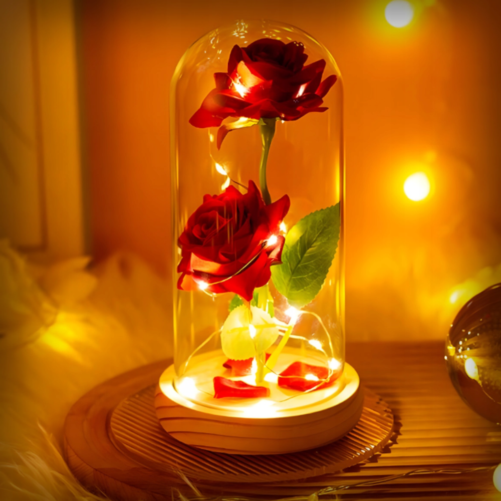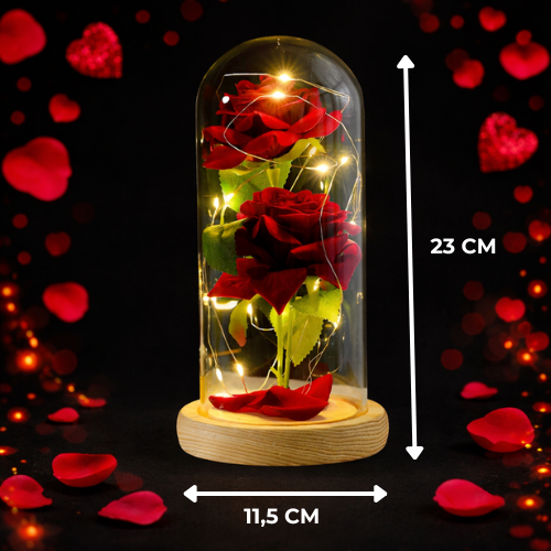 Wieczna róża w szkle z delikatnym światłem LED.